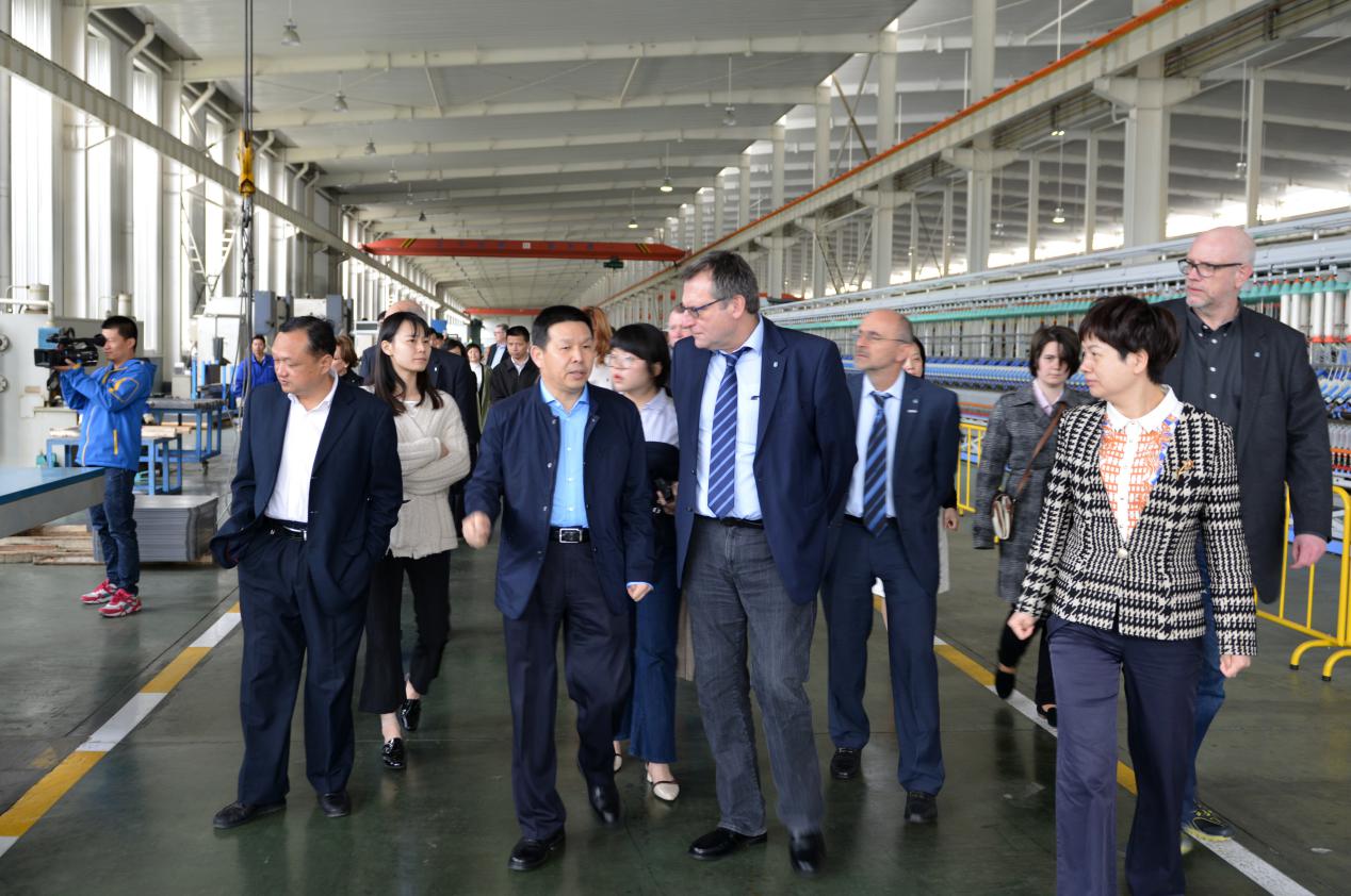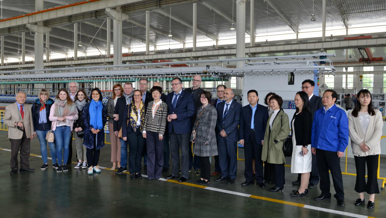 費(fèi)澤爾市長(zhǎng)(前排左3)一行在公司董事長(zhǎng)沈方勇陪同下參觀天門紡機(jī)