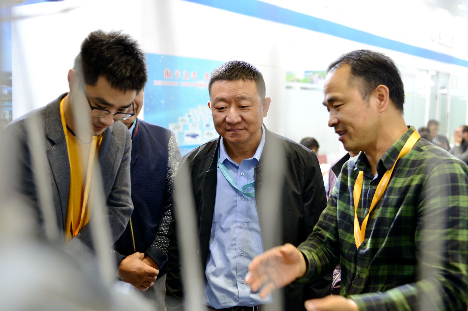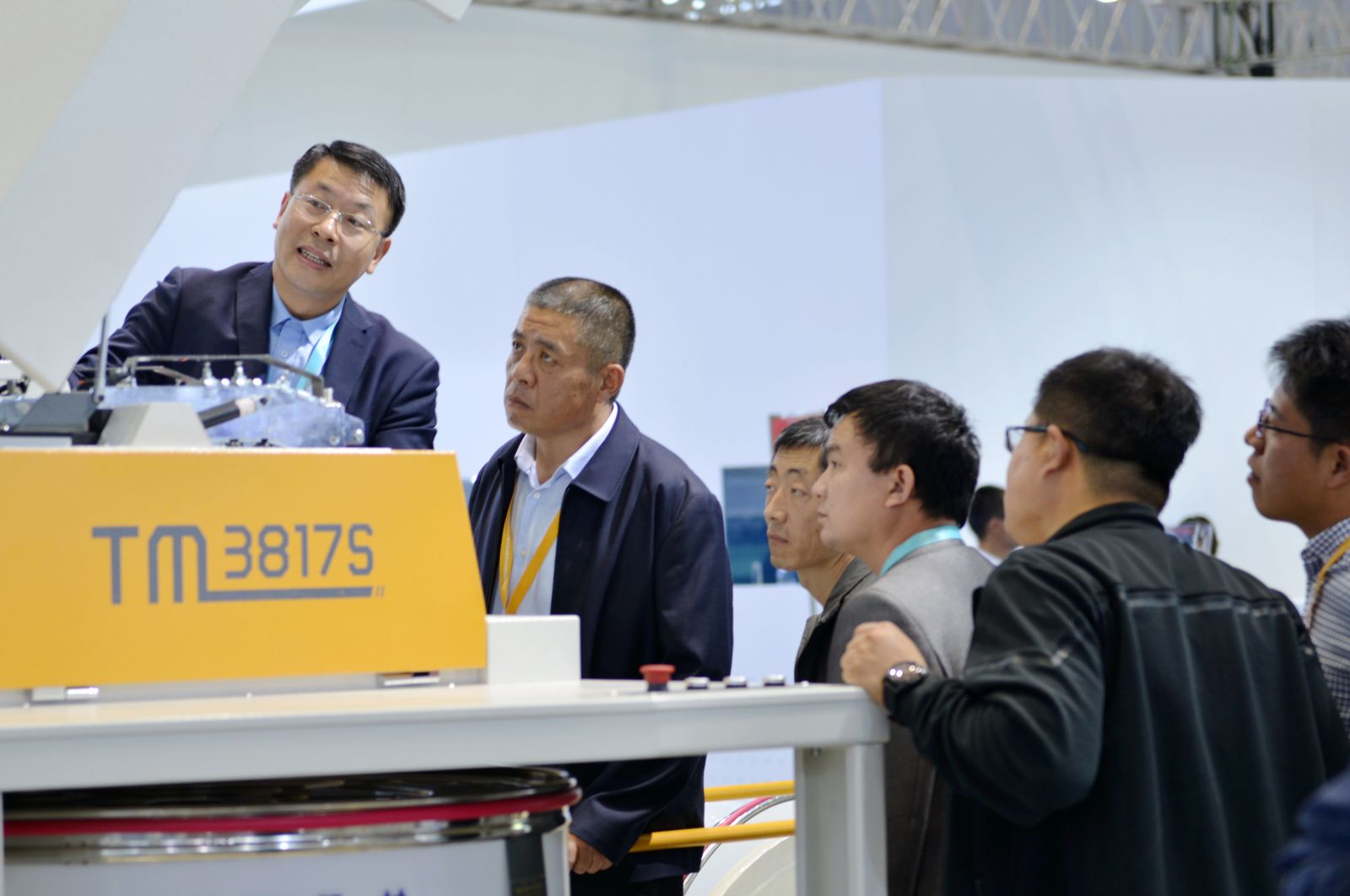 公司董事長沈方勇向中紡聯原會長杜鈺洲(右3)、中國紡織機械協會會長王樹田(右2)介紹參展新產品特點