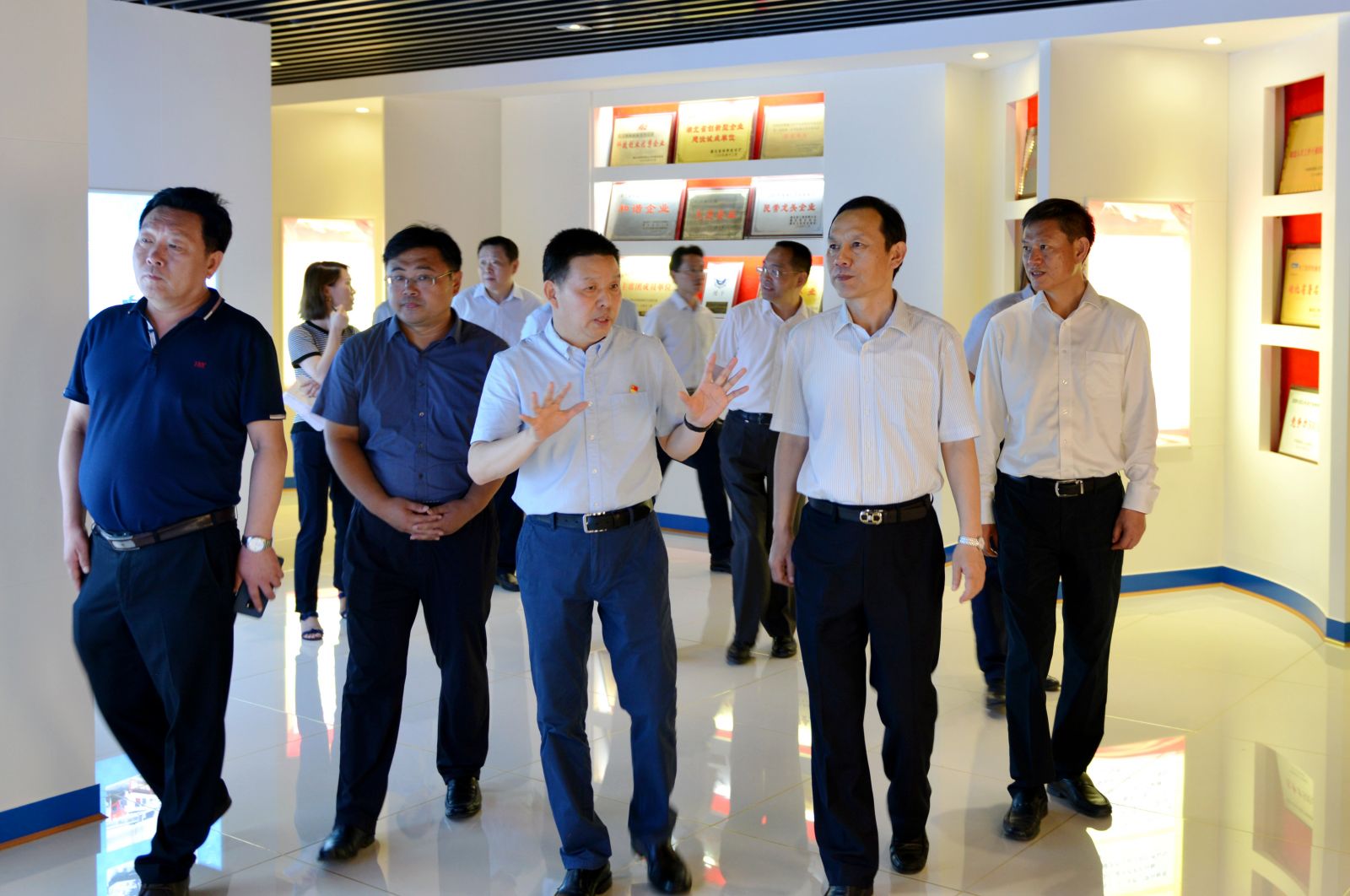 湖北省委副書記、武漢市委書記馬國(guó)強(qiáng)(前中)、天門市委書記莊光明(前右)聽取天門紡機(jī)董事長(zhǎng)沈方勇(前左)匯報(bào)產(chǎn)品研發(fā)情況