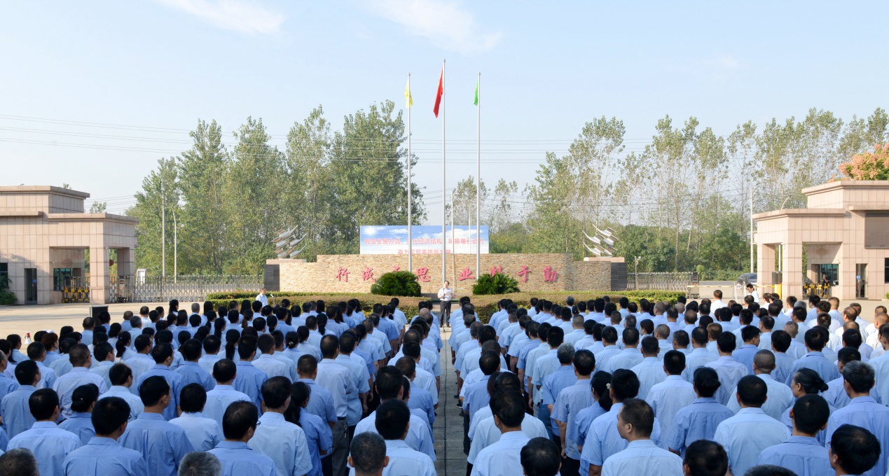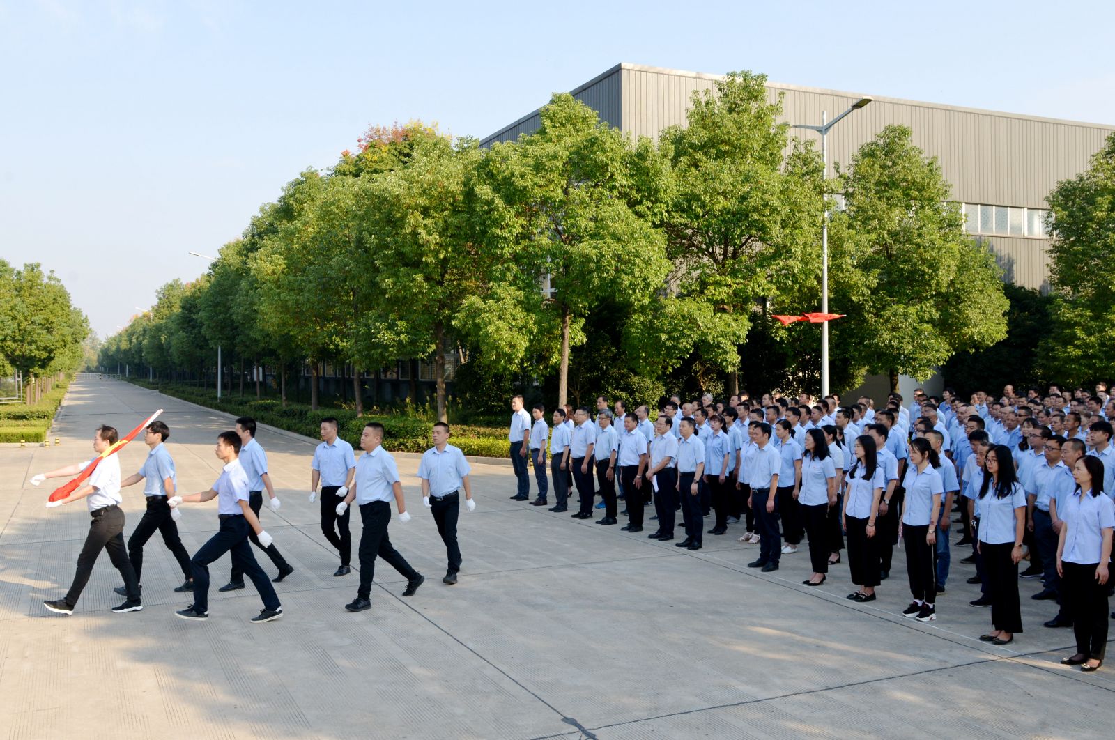 8:20時(shí),活動(dòng)儀式在總經(jīng)理焦倫進(jìn)的主持下啟動(dòng),七名旗手邁正步從員工方隊(duì)繞過(guò),直達(dá)旗壇,行進(jìn)口令威武響亮。在主持人的指令下,三名旗手將一面鮮艷的五星紅旗在莊嚴(yán)的國(guó)歌聲中徐緩地升上天空,員工方隊(duì)注目國(guó)旗,唱起雄壯的國(guó)歌。