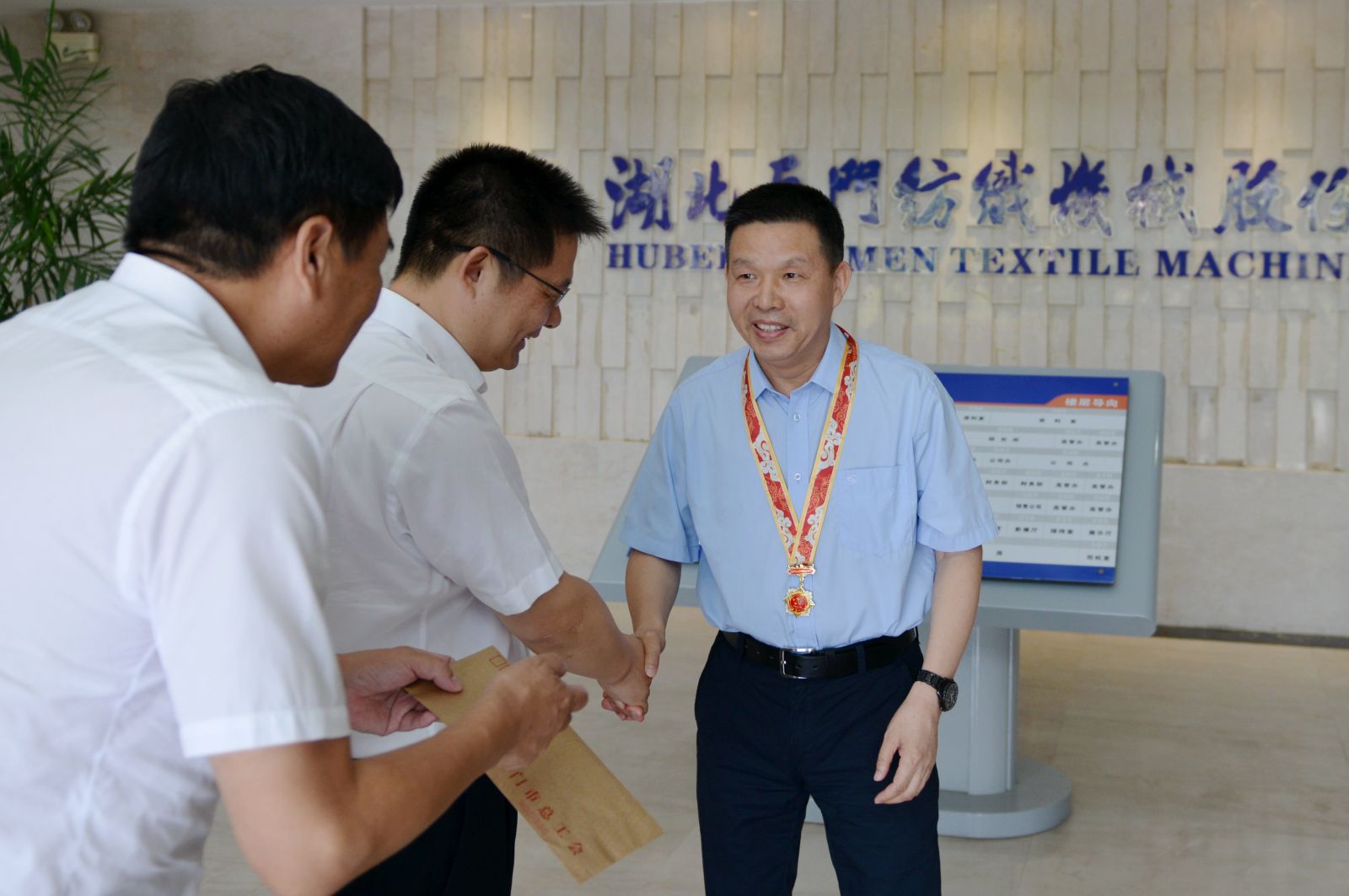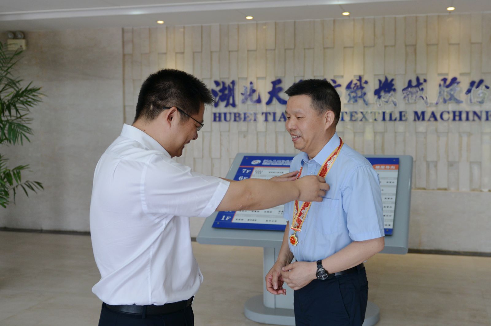 9月30日上午,天門市委、市政府及總工會(huì)相關(guān)領(lǐng)導(dǎo)來到天門紡機(jī),為董事長沈方勇頒發(fā)由中共中央、國務(wù)院、中央軍委授予的“慶祝中華人民共和國七十周年”紀(jì)念章,并與沈方勇董事長親切合影留念。