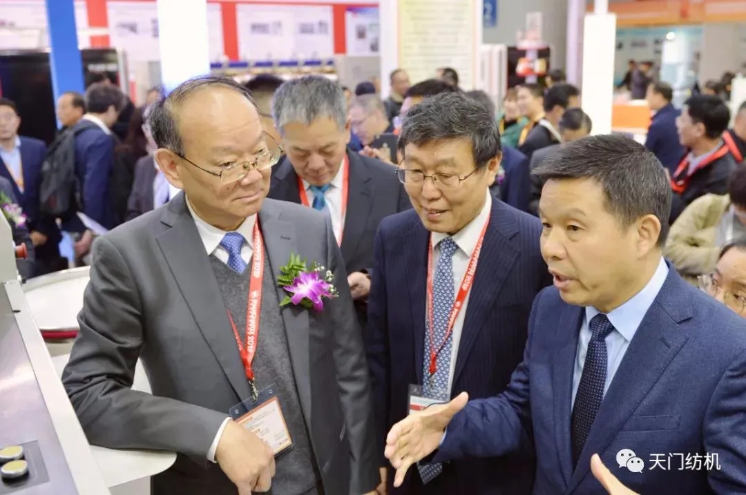 沈方勇董事長在2019年上海國際紡機展上,向中國紡聯(lián)黨委書記兼秘書長高勇等領導介紹天門紡機新產品開發(fā)情況