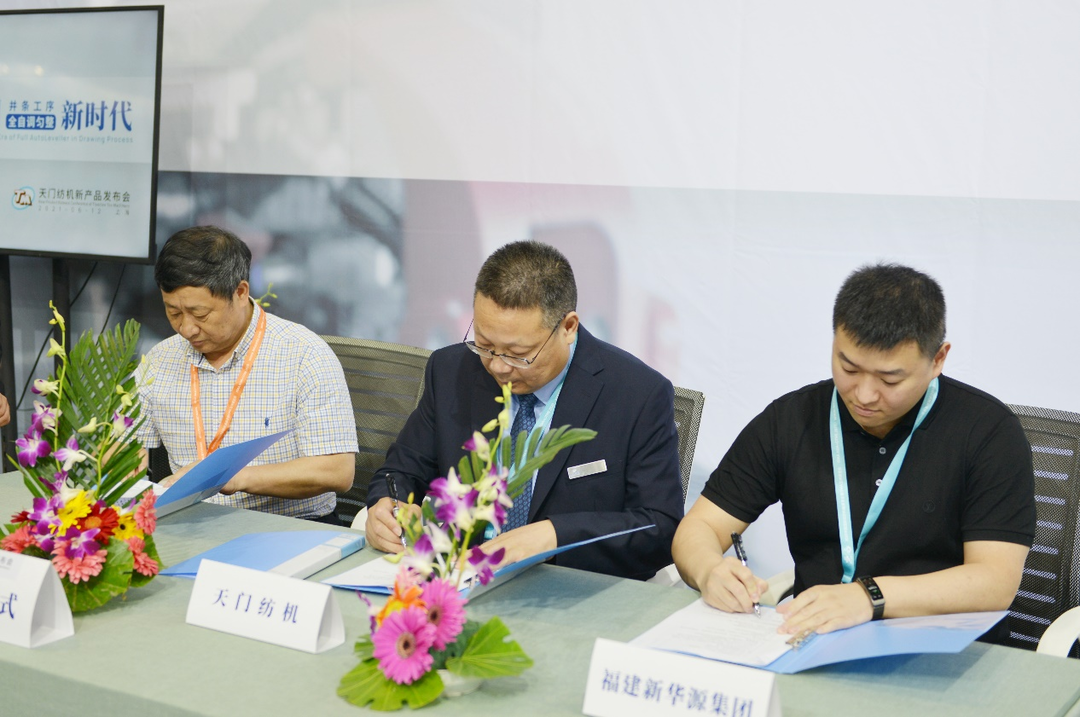 發(fā)布會上,TM15、TM19首批客戶福建新華源紡織集團(tuán)有限公司、湖北妙虎紡織有限責(zé)任公司等紡企,與天門紡機(jī)現(xiàn)場簽訂戰(zhàn)略合作協(xié)議,將在“并條工序全自調(diào)勻整”深度合作、攜手共進(jìn)。
