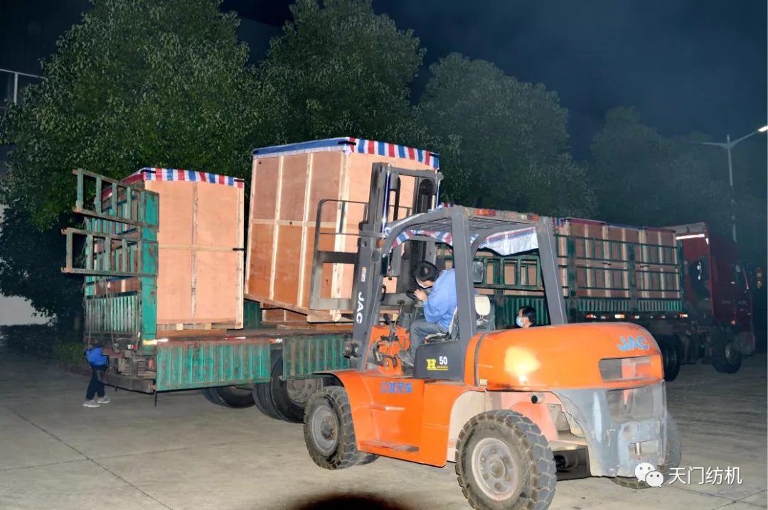 燈火闌珊處,機器轟鳴聲。已是臘月二十一的晚上,天下著冷冷細雨,神州大地處處已有年味,但在天門紡機廠區(qū)仍然一派繁忙景象:數(shù)萬平米的車間內(nèi)全都燈火輝煌,工人們緊張有序的在工作;車間外,幾輛大貨車一字形排開,正在上貨發(fā)往淮北華孚和魯泰紡織。