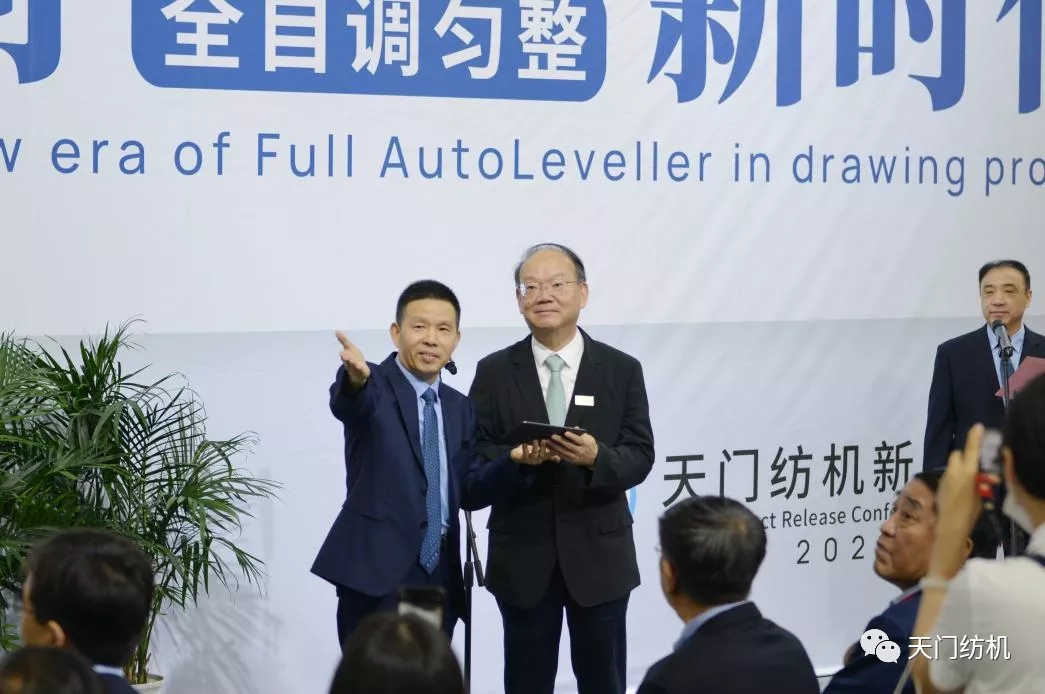 2021年6月12日,在上海國際紡機(jī)展上天門紡機(jī)舉行“開創(chuàng)并條工序全自調(diào)勻整新時代”新品發(fā)布會,中紡聯(lián)黨委書記高勇使用手持終端為新產(chǎn)品開機(jī)