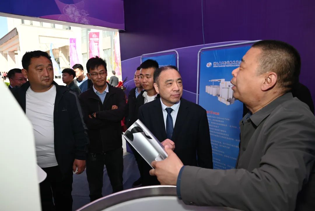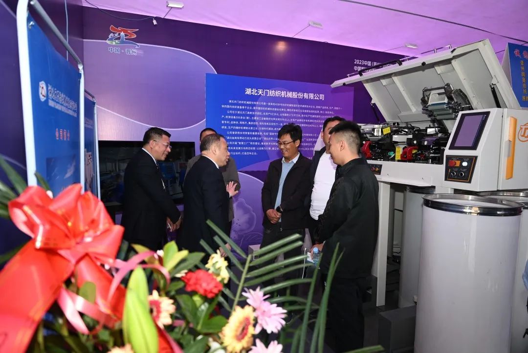 天門紡機總經(jīng)理焦倫進向蒞臨公司展位的晉州市長王林(右2)、中國服裝協(xié)會常務(wù)副會長楊金純(右1)、晉州市紡織服裝行業(yè)協(xié)會會長李永強(左1)介紹公司與晉州紡織企業(yè)合作情況