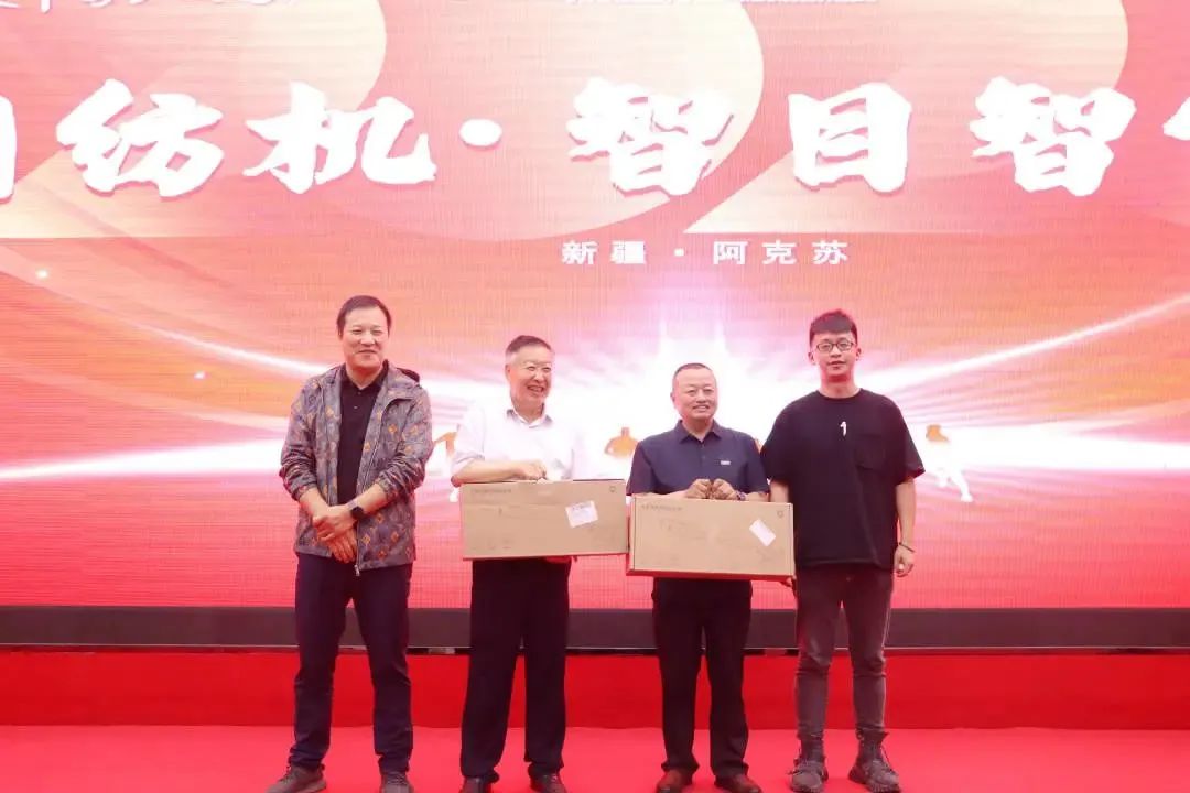 天門紡機新疆辦事處主任趙凱抽取一等獎并頒獎合影