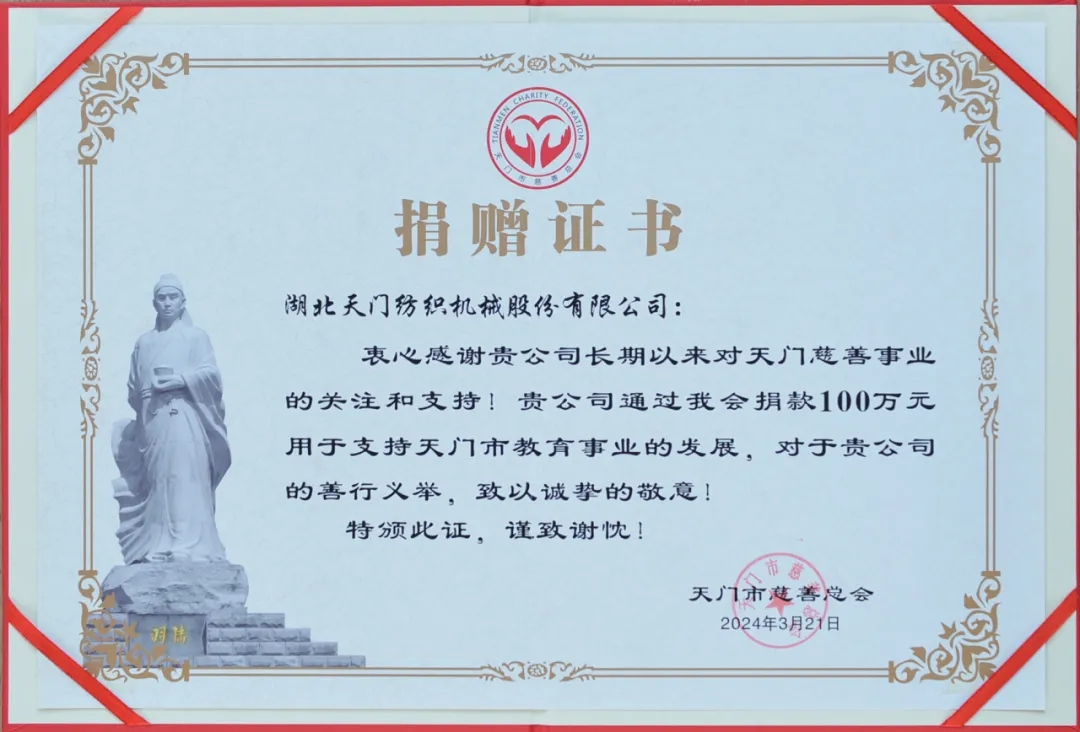 2024年3月21日,天門紡機董事長沈方勇出席在天門市盧市鎮(zhèn)盧家口中學(xué)舉行的天門慈善總會“紅燭教育基金”成立暨首捐儀式,同天門市慈善總會、教育局三方簽訂了《天門市慈善總會“紅燭教育基金”協(xié)議書》,并現(xiàn)場捐贈100萬元,用于獎勵盧市鎮(zhèn)優(yōu)秀教師和幫扶困難教師等公益活動,助力盧市鎮(zhèn)教育高質(zhì)量發(fā)展。天門市人民政府副市長古玉麗,天門市民政局局長、市慈善總會會長謝金才,天門市教育局局長劉華陽,天門市慈善總會秘書長李貴清,盧市鎮(zhèn)宣傳統(tǒng)戰(zhàn)委員劉恒超以及盧市鎮(zhèn)部分教師代表等參加首捐儀式。盧市鎮(zhèn)黨委書記趙君波主持儀式。