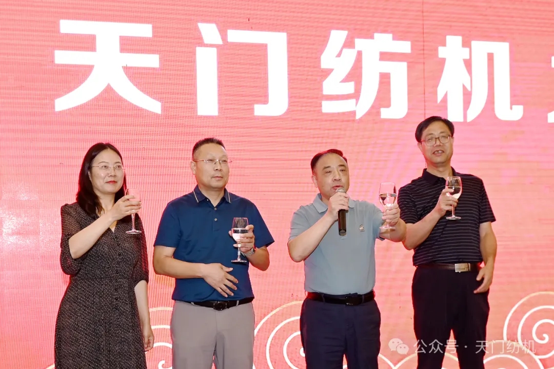 陜西省紡織科學(xué)研究院有限公司黨委書(shū)記、總經(jīng)理徐遠(yuǎn)志,天門(mén)紡機(jī)總經(jīng)理焦倫進(jìn),天門(mén)紡機(jī)副總經(jīng)理肖少華,《棉紡織技術(shù)》期刊社副總經(jīng)理冉軍麗答謝晚宴共同祝酒