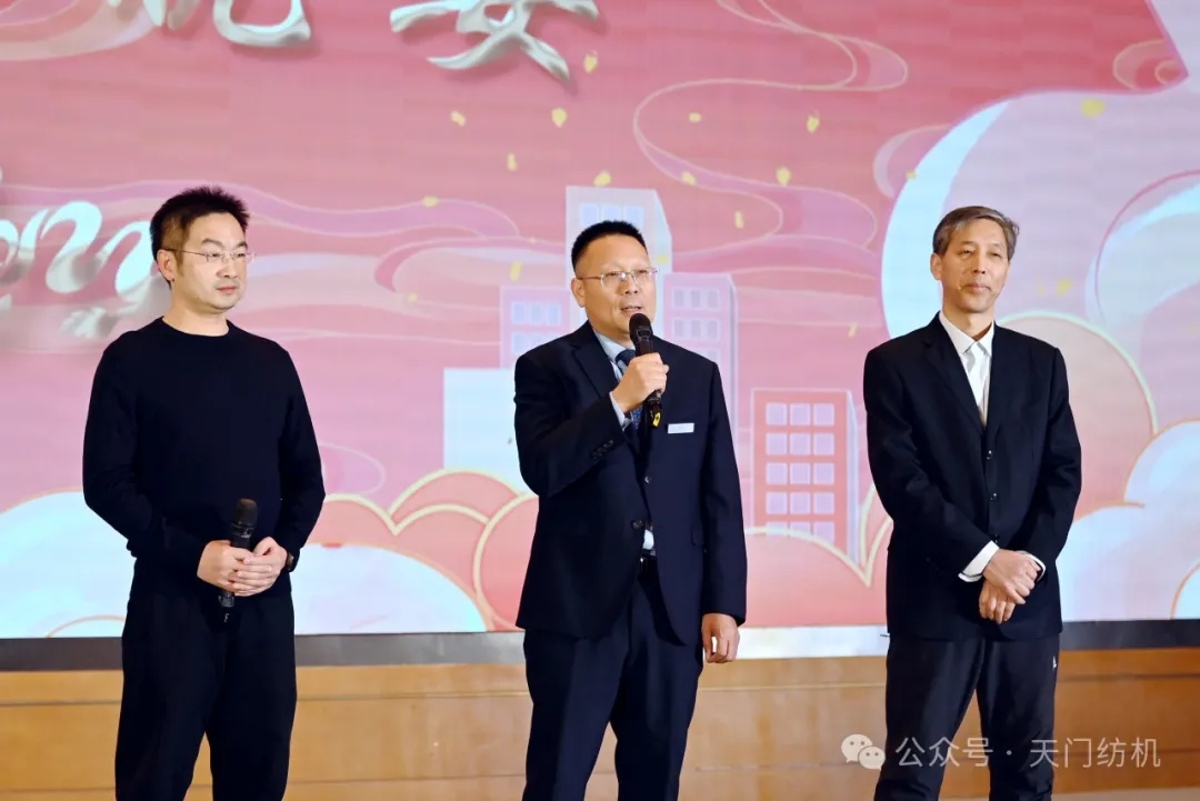 雙清智能總經(jīng)理蔡文超(左)、天門紡機(jī)副總經(jīng)理肖少華(中)、紗線網(wǎng)常務(wù)副總裁孫其海(右)為晚宴致辭