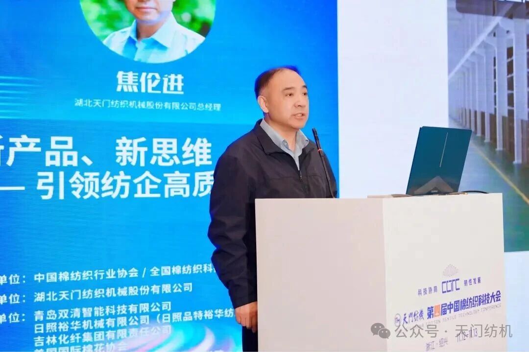 天門紡機總經理焦倫進代表冠名單位致辭。他表示,40余年來,天門紡機秉持“并條做精、企業(yè)做強”初心,深耕并條機領域,以優(yōu)質產品、服務及品牌引領行業(yè)發(fā)展。其雙眼自調勻整并條機已在棉紡企業(yè)廣泛推廣應用,顯著提升了紗線質量與生產效率,成為紡紗企業(yè)必備裝備;“并條工序全自調勻整”理念亦獲得客戶認可,有效改善紗線和布面質量。在技術創(chuàng)新方面,天門紡機成果豐碩,TM1系列并條機已成紡織行業(yè)主力產品,T2系列產品正逐步推向市場,搭載智能在線檢測、一控多軸多臺及數據管理云平臺技術的“產線聯(lián)動”并條機引起了業(yè)界廣泛關注。同時,天門紡機全力推進“智改數轉”,“智慧工廠”項目正在如火如荼地建設之中。他指出,天門紡機始終關注行業(yè)的最新動態(tài)和前沿技術,希望與業(yè)界加強溝通與合作,攜手發(fā)展。